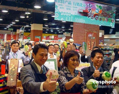 2008臺灣云林農(nóng)特產(chǎn)品北京展銷及貿(mào)易洽談會7月17日舉辦。圖為云林縣長、云林農(nóng)業(yè)合作社聯(lián)合社顧問蘇治芬(前排右二)與展銷團成員在某百貨公司為農(nóng)特產(chǎn)品做促銷。中新社發(fā) 劉舒凌 攝