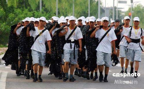 7月20日,北京奧運會開幕式演職人員帶著道具走進“鳥巢”。離奧運開幕越來越近,北京國家體育場“鳥巢”里正加緊開幕式的彩排工作。中新社發(fā) 王東明 攝