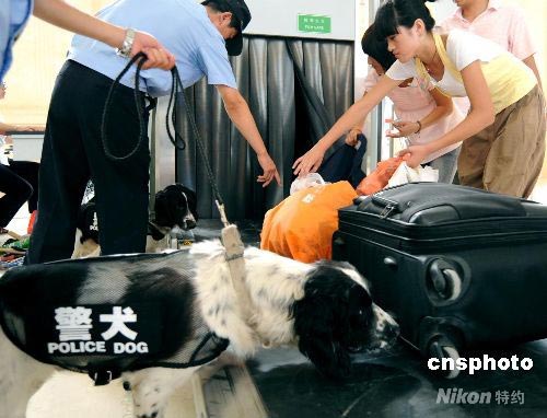 為確保二00八北京奧運(yùn)會(huì)青島奧帆賽的安全,青島火車站鐵路公安處引進(jìn)德國邢偵犬、比利時(shí)緝毒犬、英國搜爆犬等犬種,對客貨物品進(jìn)行嚴(yán)格檢查,在青島火車站廣場上巡邏盤查可疑人員。圖為旅客進(jìn)站物品通過安檢后搜爆犬再次把關(guān)。 中新社發(fā) 曲連遵 攝