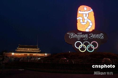 7月28日,天安門(mén)廣場(chǎng)迎接奧運(yùn)會(huì)花卉景觀制作工作進(jìn)入最后收尾階段,用鮮花裝點(diǎn)的“中國(guó)印”彩燈在晚上點(diǎn)亮,喜迎北京奧運(yùn)會(huì)。 中新社發(fā) 富田 攝