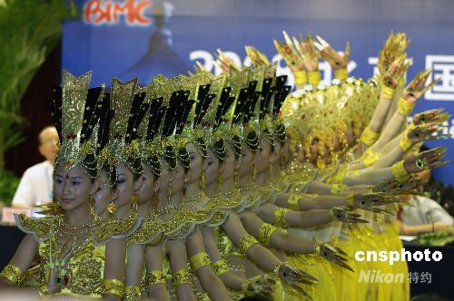 8月4日,中國(guó)殘疾人藝術(shù)團(tuán)的演員在北京國(guó)際新聞中心向前來(lái)采訪(fǎng)奧運(yùn)會(huì)的國(guó)內(nèi)外非注冊(cè)記者表演“千手觀(guān)音”。中新社發(fā) 王東明 攝