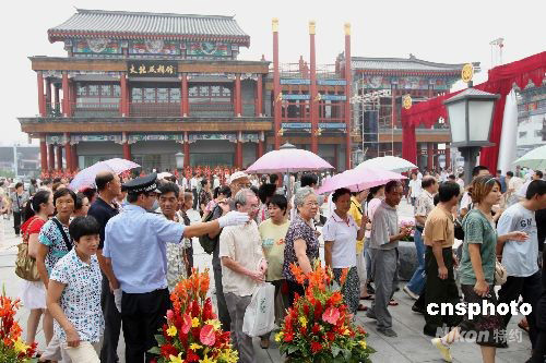 8月7日,眾多北京市民及外地游客在警察的疏導(dǎo)下,有次序地參觀改造后的北京前門大街。當(dāng)日,北京前門大街正式對(duì)外開放。經(jīng)過(guò)2年多的擴(kuò)建、改造,老牌樓、有軌電車、老字號(hào)店鋪重現(xiàn)老北京時(shí)的風(fēng)貌。中新社發(fā) 史利 攝