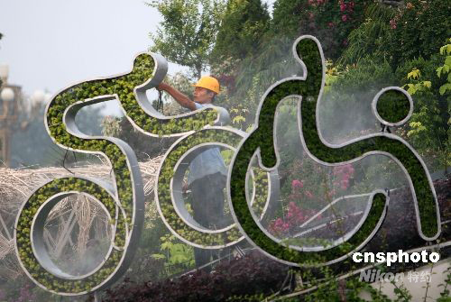 2008年8月27日,工作人員在天安門廣場(chǎng)布置殘奧會(huì)景觀,更換新鮮花卉。為迎接即將于9月6日開(kāi)幕的北京殘奧會(huì),天安門廣場(chǎng)北京殘奧會(huì)景觀布置工作正在加緊進(jìn)行中。中新社發(fā) 魯谷 攝