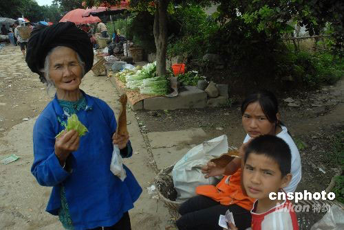 8月31日是四川攀西地震發(fā)生后的第二天,也是地震災(zāi)區(qū)當(dāng)?shù)剜l(xiāng)鎮(zhèn)趕集的日子。在距離震中約四十公里的地震災(zāi)區(qū)大龍?zhí)多l(xiāng)村民照常趕集,購(gòu)買日常用品。圖為當(dāng)?shù)匕耸啐g的李姓老人帶著孫子、孫女到集市吃小吃。中新社發(fā) 保旭 攝