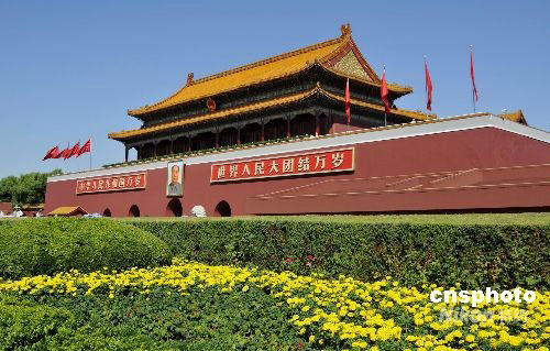 9月1日,北京奧運(yùn)會(huì)后,天安門城樓重新粉刷裝飾一新,在藍(lán)天鮮花的陪襯下,更顯雄偉壯觀,迎接殘奧會(huì)即將到來。中新社發(fā) 王宇婷 攝