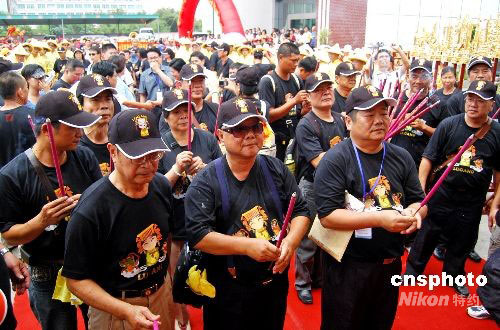 九月五日中午,臺(tái)灣鹿港天后宮進(jìn)香團(tuán)的三百多名媽祖信眾由金門(mén)分兩批乘船抵達(dá)泉州石井對(duì)臺(tái)客運(yùn)碼頭,進(jìn)行為期五天的謁祖進(jìn)香活動(dòng)。 這是鹿港天后宮開(kāi)基媽祖一百九十一年后重回大陸謁祖。據(jù)介紹,鹿港天后宮媽祖,是三百多年前施瑯將軍從福建引請(qǐng)到臺(tái)灣的。曾于清嘉慶二十二年(一八一七年)在鹿港八郊人士護(hù)送回湄洲祖廟謁祖,迄今已一百九十一年,這次再回祖廟會(huì)香,見(jiàn)證兩岸媽祖神緣。中新社發(fā) 傅丹丹 攝