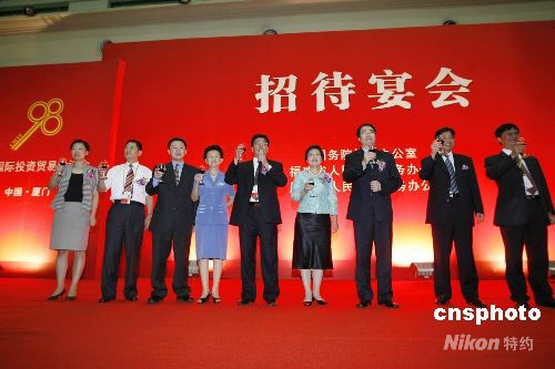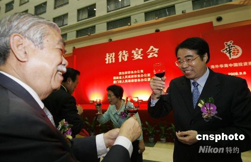 九月八日晚,國務院僑辦在廈門設宴款待出席“2008海外華商中國投資推介會”高端訪談及“改革開放三十年僑資企業(yè)成就展”的嘉賓,國務院僑辦、福建省僑辦及廈門市僑辦領導上臺感謝僑商僑資為祖國經(jīng)濟建設付出的努力。中新社發(fā) 王麗南 攝