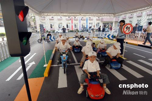 9月11日,為期三天的2008BMW兒童交通安全訓(xùn)練營(yíng)沈陽站在和平區(qū)少年宮開營(yíng)。在BMW兒童交通安全主題公園里,十字路口、交通崗、紅綠燈、斑馬線、雙黃線、警示牌等一應(yīng)俱全。來自沈陽多所幼兒園的80名孩子駕駛著玩具寶馬汽車、摩托車和自行車行駛在這一個(gè)“縮小版”的繁華街道上。中新社發(fā) 文契 攝