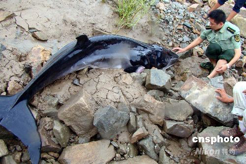 9月13日上午,一條鯨魚(yú)受強(qiáng)臺(tái)風(fēng)“森拉克”影響而迷失了航向,擱淺在浙江溫州市靈昆島的灘涂上。發(fā)現(xiàn)受傷鯨魚(yú)后,靈昆邊防派出所官兵迅速展開(kāi)營(yíng)救,和當(dāng)?shù)厝罕娨黄饘R淺鯨魚(yú)送歸大海。據(jù)悉,該鯨魚(yú)長(zhǎng)約2.5米,重約700余斤,尾部被巖石刮傷,屬于須鯨類。中新社發(fā) 吳水斌 攝