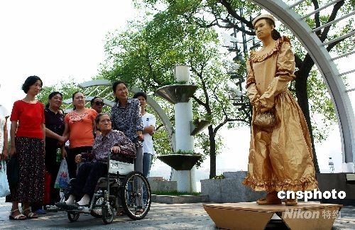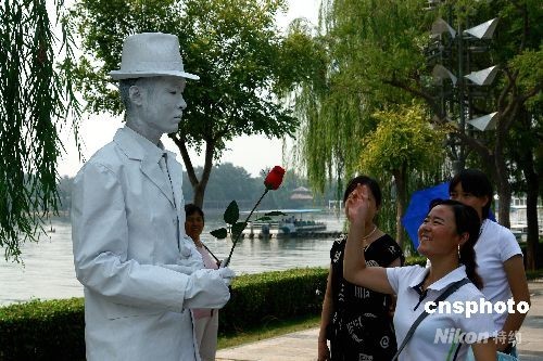 9月14日,在天津水上公園中秋游園會(huì)上,由四人組成的人體活雕塑展成了亮點(diǎn)。這些人體活雕塑在進(jìn)行表演的同時(shí),還與游客合影、互動(dòng),給中秋游園會(huì)增添了靚麗風(fēng)景。中新社發(fā) 展曉仁 攝