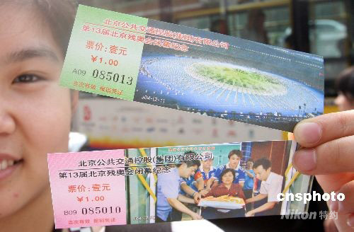 9月17日,一位女乘客展示剛購買的殘奧會閉幕紀(jì)念車票。當(dāng)日,北京市公交集團(tuán)在所屬線路車上,發(fā)售殘奧會閉幕紀(jì)念車票,每張票價一元。 中新社發(fā) 陳曉根 攝