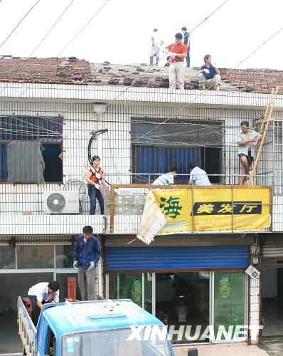 當(dāng)?shù)厝罕娬趽屝薇积埦盹L(fēng)毀壞的屋頂。