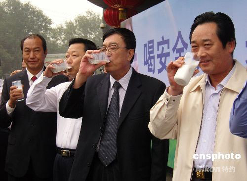 9月25日,在石家莊市最繁華的先天下購物廣場,該市副市長張殿奎(右二)帶頭將滿滿一大杯某品牌純牛奶一飲而盡,隨行的石家莊市工商局、質量技術監(jiān)督局、商務局等相關部門負責人也紛紛效仿,將手中品牌各異的滿杯純牛奶全部喝下,以消除此間民眾因三鹿問題奶粉事件而產生的顧慮。