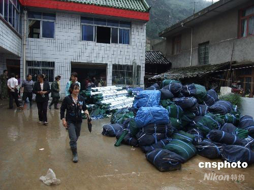 地震重災(zāi)區(qū)四川省北川縣連日暴雨襲擊。從24日起,綿陽市緊急調(diào)運大批帳蓬、棉被、食品、飲用水、藥品等救災(zāi)物資及生活用品,確保受災(zāi)民眾基本生活需要。圖為25日中午一些北川受災(zāi)民眾正在任家坪村委會領(lǐng)取救災(zāi)物資。中新社發(fā) 王建 攝