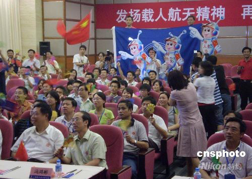 九月二十五日晚九時十分,“神七”順利升空。在上海航天局內,數百名為“神七”的研制付出辛勞汗水的航天工作者們,為“神七”的成功發(fā)射而歡呼雀躍。中新社發(fā) 宗晨亮 攝