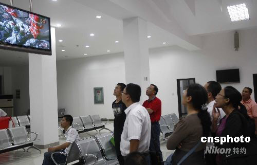 9月25日晚,“神七”升空引起國(guó)人關(guān)注,圖為在江蘇南通興東機(jī)場(chǎng)候機(jī)的乘客觀看“神七”升空的電視直播。中新社發(fā) 盛佳鵬 攝