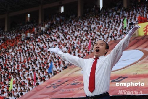 2008年9月28日,重慶市云陽縣在該縣體育場舉行盛大活動慶祝國慶節(jié),近萬名機(jī)關(guān)干部、中小學(xué)生、社區(qū)群眾齊唱《歌唱祖國》、《沒有共產(chǎn)黨就沒有新中國》、《閃閃的紅星》等經(jīng)典紅歌,祝福祖國節(jié)日快樂,更加繁榮富強(qiáng)。中新社發(fā) 劉小洋 攝