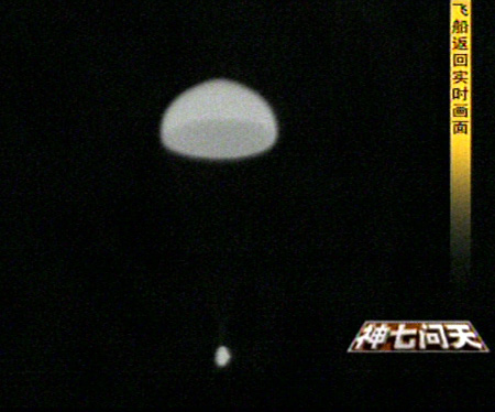 9月28日,神舟七號(hào)飛船返回艙主降落傘打開(kāi)。