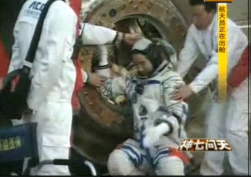 9月28日,神舟七號飛船返回艙順利著落,三名航天員翟志剛、劉伯明、景海鵬在經(jīng)過15-20分鐘的重力再適應后全部出艙。首先出艙的是翟志剛,第二個出艙的是劉伯明,第三個出艙的是景海鵬。