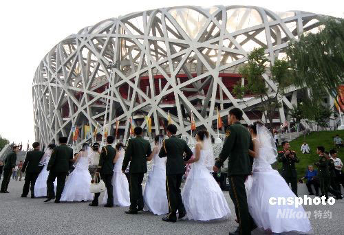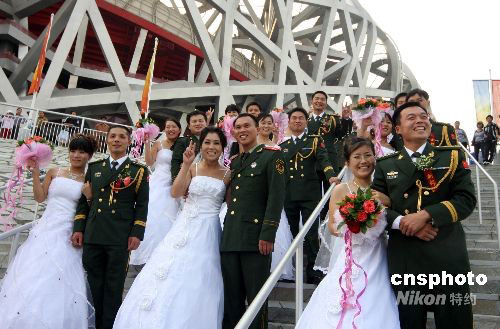 9月30,喜結(jié)良緣的奧運(yùn)安保武警與新娘在國家體育場“鳥巢”前集體留影。當(dāng)天,武警十三支隊(duì)21位奧運(yùn)安保武警在數(shù)次推遲婚期后,終于步入婚姻殿堂。據(jù)了解,這21位武警戰(zhàn)士從今年初開始就沒有休過一天假,原定的婚期一拖再拖,直到奧運(yùn)結(jié)束后,才定為國慶節(jié)期間完婚。中新社發(fā) 吳芒子 攝