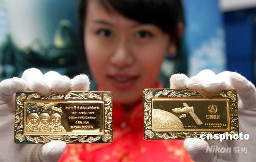 10月9日,為紀念神舟七號成功發(fā)射和中國首次太空行走圓滿成功,作為國家紀念 “神七”飛天活動的重要組成部分,中國航天部門首次面向全球發(fā)行“金鑲鉆神七金條”!敖痂傘@神七金條”分45克、90克、300克和1000克四種規(guī)格,全部采用999純黃金制作,正面的主體圖案為三位宇航員肖像,背面為神七飛船和宇航員出艙行走的風姿,這在中國航天史上尚屬首次。中新社發(fā) 趙雋 攝