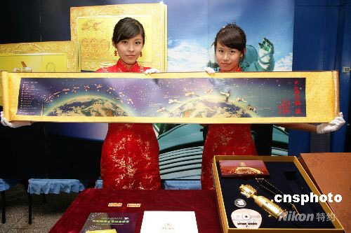 圖為工作人員展示為配合“神七”紀念金條發(fā)行的一幅1.6米神舟七號載人航天飛行紀念純金藏卷。