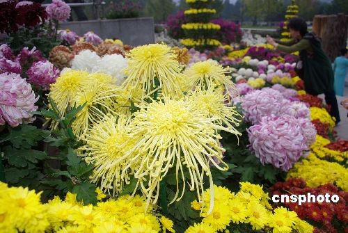 10月13日,游客在北京植物園菊花展區(qū)內(nèi)流連忘返,頻頻發(fā)出贊嘆之聲。在本屆花展中,公園將菊花作成了各種菊花塔、盤(pán)龍?jiān)煨停煌瑫r(shí)還用菊花打造了色彩明快的花帶。目前園中有1000多個(gè)品種10萬(wàn)株菊花。中新社發(fā) 九州 攝