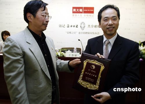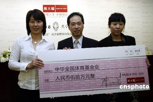 10月15日,著名珠寶品牌周大福在國(guó)家體育總局,舉行名為“銘記2008,共享璀璨榮耀”的慈善捐贈(zèng)新聞發(fā)布會(huì),宣布將周大福Forevermark永恒印記“榮耀之星”的部分拍賣款項(xiàng)50萬元人民幣,捐助予“中華全國(guó)體育基金會(huì)(中國(guó)運(yùn)動(dòng)員委員會(huì))”,這也是該委員會(huì)成立以來的首筆社會(huì)愛心團(tuán)體的公益捐贈(zèng),此筆善款將用于支持該委員會(huì)開展體育公益工作,以號(hào)召更多企業(yè)關(guān)注和支持中國(guó)體育事業(yè)發(fā)展。周大福董事陳世昌先生、國(guó)家體育總局體育基金管理中心副主任、中華全國(guó)體育基金會(huì)副理事長(zhǎng)王彥敏先生與著名運(yùn)動(dòng)員周繼紅女士(國(guó)家體育總局游泳運(yùn)動(dòng)管理中心副主任、運(yùn)動(dòng)員委員會(huì)主任委員),錢紅女士(游壇“五朵金花”之一),高紅(“鏗鏘玫瑰”之一、老國(guó)家女足守門員)均蒞臨現(xiàn)場(chǎng)。此前拍賣的Forevermark永恒印記“榮耀之星”27.16克拉梨形美鉆,作為周大福專為2008年北京奧運(yùn)會(huì)獻(xiàn)禮之作,脫胎于重達(dá)70克拉的南非原產(chǎn)鉆胚。更為珍貴之處在于在其臺(tái)面上印記有源自周大福鉆石原胚全球合作伙伴——世界最大的鉆石原胚供應(yīng)商戴比爾斯集團(tuán)的“Forever mark”永恒印記”,其中特別珍選并全球唯一的“20080808”序列號(hào)碼,特別銘記2008北京奧運(yùn),銘記中華體育世紀(jì)盛事。中新社發(fā) 楊可佳 攝