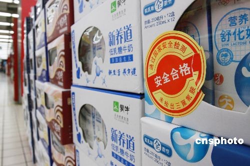 10月16日,北京一度下架的個別品牌液態(tài)奶,經(jīng)權(quán)威機(jī)構(gòu)檢驗合格后,貼上安全合格標(biāo)識重新上架銷售。目前“下架奶”生產(chǎn)廠家已經(jīng)將重新檢驗且合格的批次報告?zhèn)鬟_(dá)到超市,被檢產(chǎn)品則“仍在廠內(nèi)加緊貼上象征合格的綠色統(tǒng)一標(biāo)識”,預(yù)計蒙牛、伊利等品牌液態(tài)奶最遲會于17日重新回到零售終端。中新社發(fā) 鄭雄增 攝
