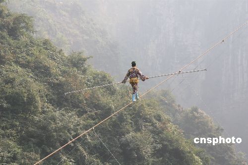 18日,“高空王子”阿迪力的親侄子賽買提·艾江在張家界天門山的萬仞絕壁之間展示了“達瓦孜”的驚人絕技。雖然賽買提在最后50米處意外“失手”,被救援人員接回終點,但在傾斜達39度的鋼繩上行走了650米,已經(jīng)成功挑戰(zhàn)了世界最大斜度的高空走鋼絲極限!斑_瓦孜”意思是“高空走繩索”,是新疆維吾爾族歷史悠久的民間傳統(tǒng)絕技。中新社發(fā) 鄧霞 攝