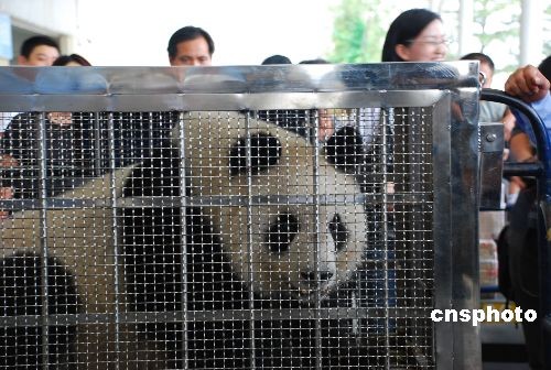 10月22日,兩只國寶級大熊貓“樂山”、“珍大”抵達(dá)杭州蕭山國際機(jī)場,立即乘車去它們的新家——浙江安吉竹博園落戶。據(jù)飼養(yǎng)員史斌遞介紹,這兩只大熊貓來自四川成都大熊貓繁育研究基地,均為雄性,每只重約100公斤,年齡都大約在兩歲半左右,相當(dāng)于人類的八九歲。它們都很好動,愛爬樹,是熊貓家族里的“運動健將”。中新社發(fā) 夏毅 攝