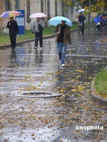 10月23日,齊齊哈爾市民走在深秋的雨中。當(dāng)日,齊齊哈爾市出現(xiàn)降雨降溫天氣。中新社發(fā) 王云龍 攝