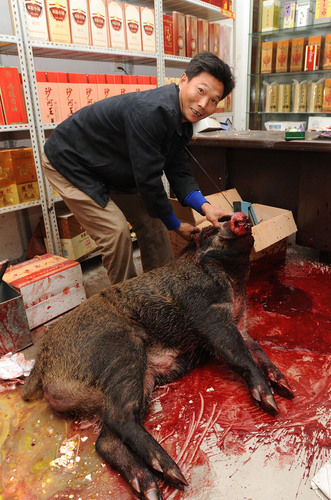 2008年10月23日,安徽省桐城市警方將闖進小鎮(zhèn)商店的三頭野豬擊斃。當天早晨,3頭野豬闖進桐城市青草鎮(zhèn),連傷4人,當?shù)鼐浇泳髮⑦@“一家三口”擊斃。