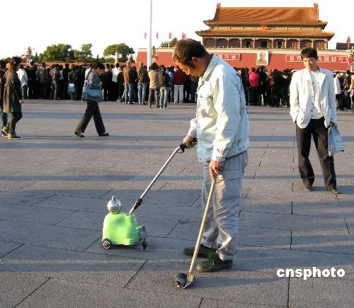 2008年10月26日,一種專門清理口香糖的袖珍電動清潔機(jī)亮相北京天安門廣場。圖為環(huán)衛(wèi)工人使用它清洗大理石上的口香糖。中新社發(fā) 玉龍 攝