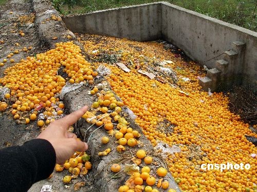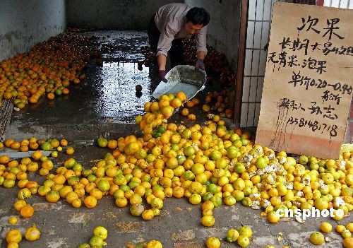 2008年10月28日,據(jù)湖北省農(nóng)業(yè)廳果品辦主任、湖北省果業(yè)協(xié)會秘書長李傳友披露,截至10月20日,湖北省已銷售柑橘68萬噸,占總產(chǎn)量的30%左右。但10月20日四川廣元“蛆柑”事件發(fā)生后,沒有出現(xiàn)疫情的湖北柑橘外銷全面停滯。經(jīng)有關(guān)部門“救市”后,10月27日才開始陸續(xù)有收購商前來收貨,收購價僅在每斤0.15元--0.35元,比往年的收購價每斤0.25元—0.65元大幅下跌。如果事態(tài)繼續(xù)發(fā)展下去,湖北省橘農(nóng)損失將達(dá)15億元左右。中新社發(fā) 劉君鳳 攝