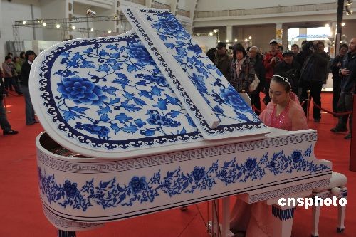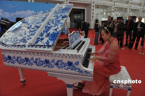 10月28日,在中國東北亞(沈陽)進口商品博覽會上,一名少女在彈奏青花瓷鋼琴。現(xiàn)場的工作人員介紹說,這架名為琴瓷的鋼琴是專門為前不久舉辦的國際樂器展覽會制作的,琴身上的瓷紋是由技術人員手工雕刻而成,目前在世界上僅有這一架,市場售價在46.9萬元左右。中新社發(fā) 徐建國 攝
