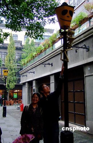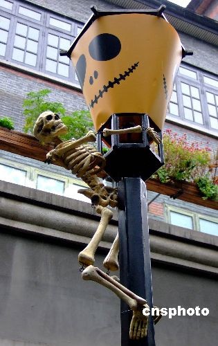 2008年10月29日,為迎接2008萬圣節(jié),上海新天地酒吧街已完成全程置景的設計布置,以綿延酒吧街數(shù)十處的萬圣置景,為游客“講述不怕鬼的故事”。南瓜頭鬼,白骨嶙峋鬼,美女鬼,小丑鬼……在路邊、酒桌上、樹頂、草地里、燈桿上、石庫門陽臺間,夸張得有趣,吸引游人目光。中新社發(fā) 蔣振雄 攝