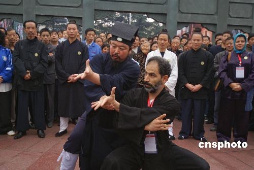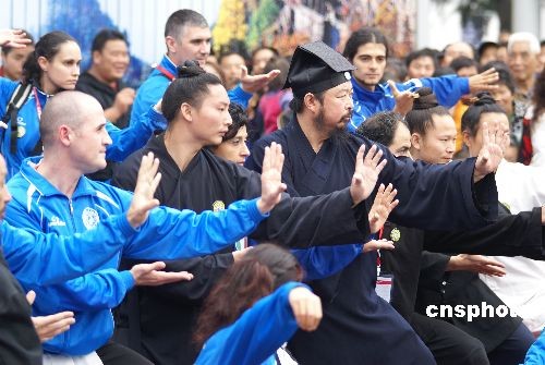 10月29日,第三屆世界傳統(tǒng)武術節(jié)在湖北十堰市舉行,來自69個國家和地區(qū)的165個代表隊的2000多名武術愛好者匯聚湖北十堰。當日上午,來自世界各地的洋弟子們在十堰市人民廣場拜武當派第14代掌門、武當派武術的代表人物游玄德道長為師,并進行武術表演。中新社發(fā) 稅曉潔 攝