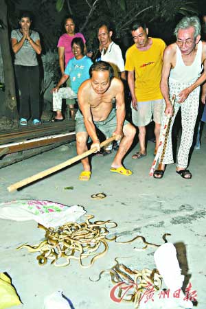 “一條小蛇躥到我的客廳里來了!”許先生回憶起看電視時的意外“發(fā)現(xiàn)”,依然滿臉緊張。繼前段時間被砸鎖、淋毒水、放炸藥之后,昨晚9時許,廣州市環(huán)市西路站西南街的省汽車運輸公司宿舍再遭襲擊,這次的“新花招”是放蛇,而且一下子就是過百條活生生的毒蛇。