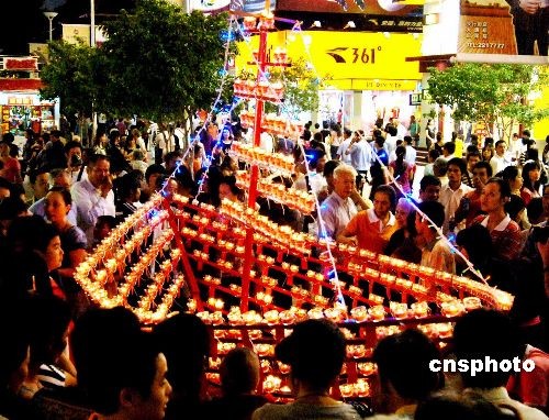 十月三十日晚,媽祖故鄉(xiāng)福建莆田舉行“點(diǎn)燭山”祈;顒(dòng),吸引眾多當(dāng)?shù)厥忻褚约扒巴鶇⒓拥谑畬娩刂迡屪嫖幕糜喂?jié)的賓朋觀看。中新社發(fā) 劉可耕 攝