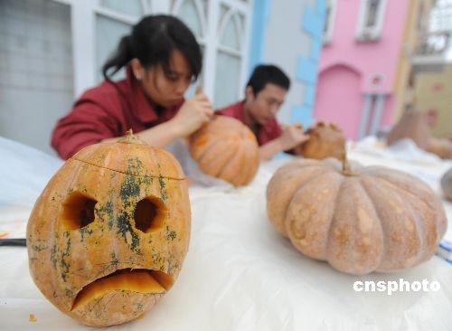 10月31日,是西方傳統(tǒng)的“鬼節(jié)”萬圣節(jié)前夜。白天,下著蒙蒙細(xì)雨的長沙處處寒意濃濃,長沙世界之窗工作人員正在雕刻的“毛骨悚然”的各式南瓜,讓這個陰冷的節(jié)日多了幾分“鬼”意。中新社發(fā) 肖前輝 攝