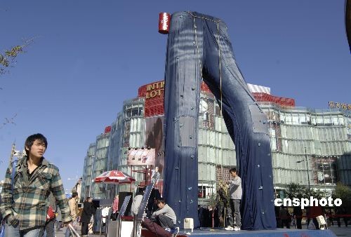 10月31日,北京王府井金街上的某商家樹起巨型牛仔褲招牌造型,吸引路人目光。在全球金融危機大背景下,眾多商家不得不利用各種新奇手法賺人眼球。中新社發(fā) 徐曦弋 攝
