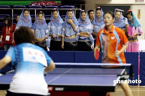 10月31日,在福建泉州舉行的第六屆全國(guó)農(nóng)運(yùn)會(huì)乒乓球男子、女子單打比賽上,身著傳統(tǒng)服飾的惠安女在現(xiàn)場(chǎng)為選手加油助威。中新社發(fā) 傅丹丹 攝