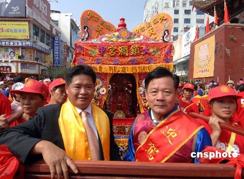 十月三十一日,在媽祖故鄉(xiāng)福建莆田舉行的第十屆湄洲媽祖文化旅游節(jié)上,“媽祖回娘家入城儀式”在市區(qū)舉行。來自十七個國家和地區(qū)的近三百多家媽祖文化機構,及臺灣一百一十五座媽祖分靈宮廟的信眾回到媽祖故鄉(xiāng)謁祖進香。海內(nèi)外來賓一千多人參加了該入城儀式。中新社發(fā) 劉可耕 攝