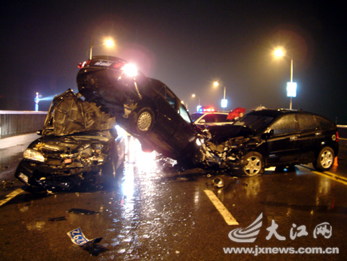 目擊者說,當(dāng)時(shí)他聽見轟的一聲后,回頭看時(shí)這三輛車已經(jīng)撞到一起,中間那輛別克轎車屁股高高翹到另一輛奇瑞小轎車的車頂上。十幾分鐘后,3輛車上的傷者被120急救車送走。事發(fā)后,交警在南昌大橋的兩頭設(shè)立警戒,一些公交車乘客步行下橋。交警稱事發(fā)時(shí)視線不好,車速很快,事故原因還在調(diào)查中。記者 徐彬