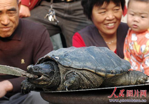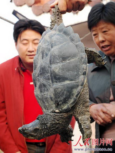 2008年11月4日,一只大“怪”龜引來(lái)眾人觀奇。這只重11.4斤的“怪”龜背部像烏龜、腹部像甲魚、尾巴又像穿山甲,是江蘇省姜堰市溱湖風(fēng)景區(qū)湖南村村民孫鳳林上周在湖中扒土?xí)r挖出的。據(jù)當(dāng)?shù)厮a(chǎn)工程師介紹初步認(rèn)定,它屬一種相當(dāng)稀少的大鱷龜,主要生存在南美洲一帶,其生性暴躁、殘忍、什么東西多吃,在水中所向無(wú)敵,建議不要進(jìn)行人工放流。