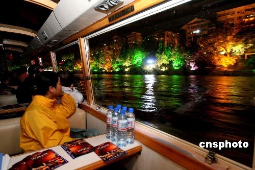 2008年桂林山水文化旅游節(jié)藝術巡游將于11月9日晚開啟序幕,眾多嘉賓云集參加多項活動。圖為11月8日晚,游客乘船欣賞桂林市區(qū)兩江四湖美麗夜景。中新社發(fā) 王麗南 攝