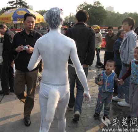 11月9日,武漢首義廣場(chǎng)舉行菊花展,晴朗的天氣給前來(lái)觀賞菊花的市民帶來(lái)了方便,市民紛紛拿出自己的相機(jī),用鏡頭將菊花與自己定格在一種美妙的記憶里。此時(shí)一名男子裸身走進(jìn)菊花展現(xiàn)場(chǎng),在菊花叢中展示了人體藝術(shù),試圖將自身與大自然融合起來(lái)。此舉引來(lái)不少市民圍觀猜議。市民王先生說(shuō):“花展是公共場(chǎng)所,在菊花叢中展示人體藝術(shù),與主題不符,不太妥當(dāng)!