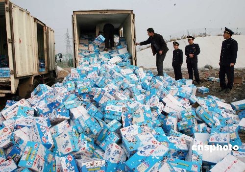11月10日,在河南省寶豐垃圾處理廠內(nèi),伴隨著碾壓機(jī)的轟轟開動,68噸不合格奶制品在工商人員的監(jiān)督下被碾壓銷毀、填埋。三鹿奶粉事件發(fā)生后,寶豐工商系統(tǒng)共出動執(zhí)法人員2103人次,檢查各種食品經(jīng)營主體9231戶次,及時對問題奶制品下架退市。中新社發(fā) 王雙正 攝