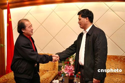 全國(guó)政協(xié)委員、中國(guó)航天科技集團(tuán)公司黨組書(shū)記馬興瑞(右)代表全體航天人向畫(huà)作《騰飛》作者、著名畫(huà)家王書(shū)平教授表示感謝。